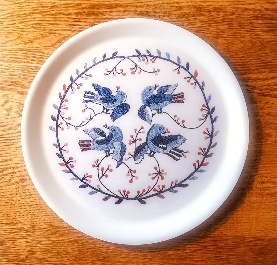 Vår vackra bricka med motiv av fågeldans i blekingefärger
