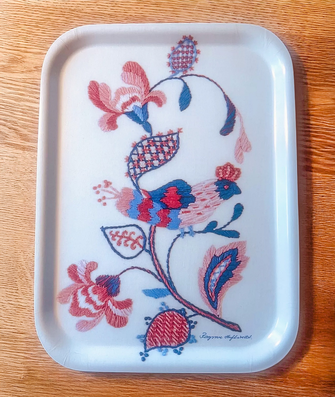 Liten rektangulär bricka med fågelmotiv från blekingesöm