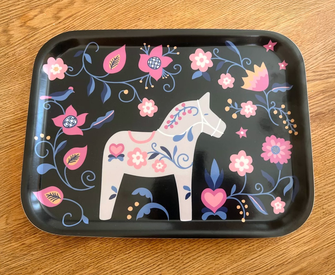Liten rektangulär bricka med dalahäst, svart