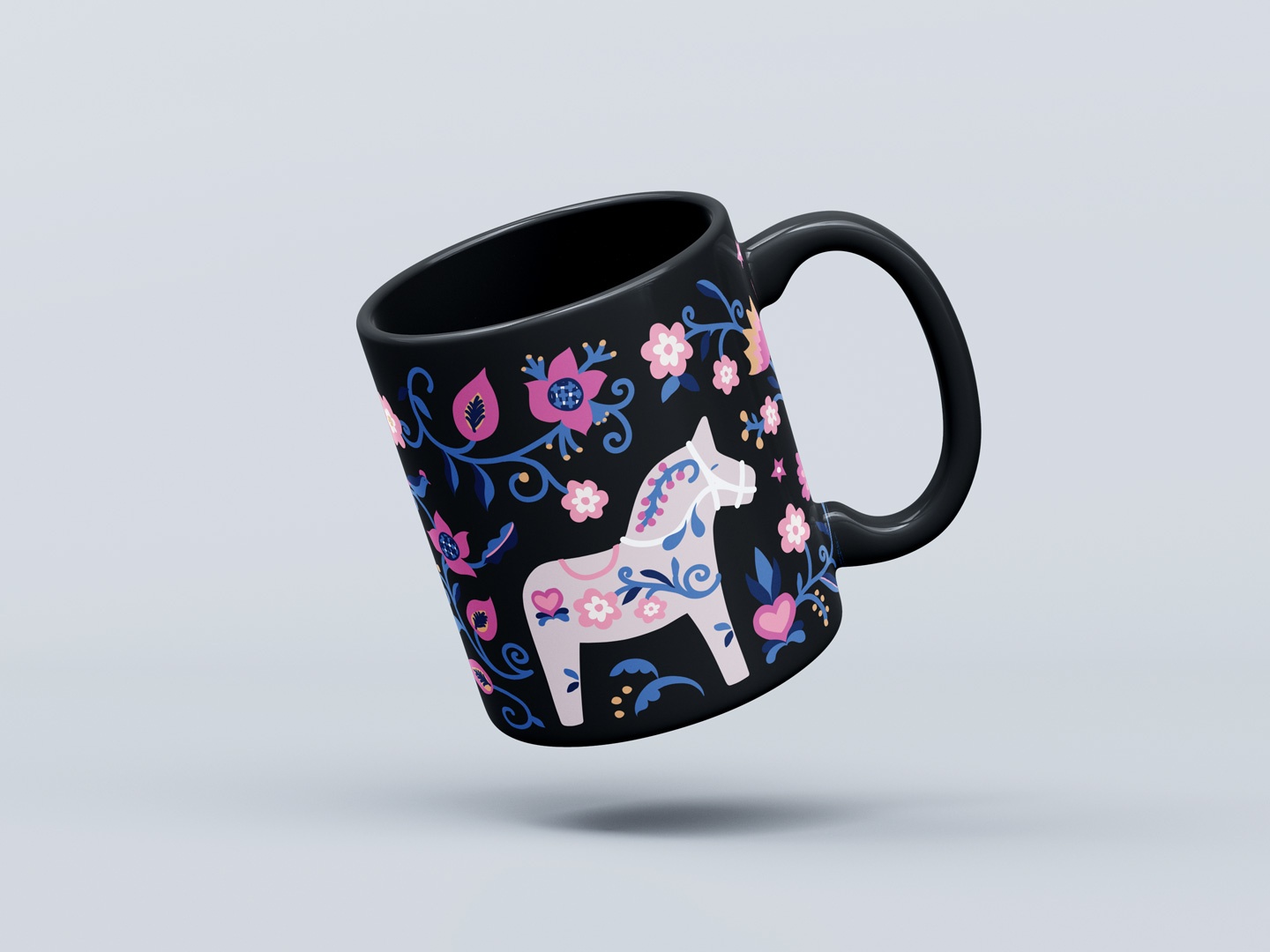 Svart mugg med Blekingemönster och Dalahäst.Kan förhandsbeställas – KOMMER UNDER VÅREN 2026.